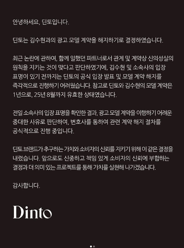 딘토는 지난 15일 공식 소셜미디어에 “전일 (김수현) 소속사의 입장 표명을 확인한 결과, 광고 모델 계약을 이행하기 어려운 중대한 사유로 판단하여, 변호사를 통해 관련 계약 해지 절차를 공식적으로 진행 중이다”라고 공지했다.