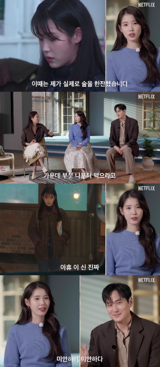 아이유는 "이때 제가 실제로 술을 한잔했다. 빨간 저 느낌이 분장으로 하면 자칫 귀엽게 보일 수 있어서 그냥 (마셨다). 선배님은 끝나고 드셨던 것 같다"고 했고, 박해준은 "오징어 건져 주고 면발 후루룩하고 연결 맞추기가 어려웠다"고 회상했다.
