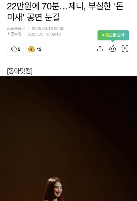 하필 같은 시기에 한 태연, 에스파 콘서트보다 비싼데 곡 수는 적고 당장 테일러 같은 가수도 혼자 40곡씩 무대 장치에 돈 써가면서 + 게스트로 가수들 초청해가면서 콘서트 돌았던지라 더 비교되는듯