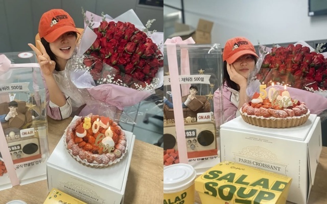 최강희 소셜미디어사진 속 최강희는 500일 축하 케이크, 꽃다발에 둘러싸인 채 행복한 미소를 짓고 있는가 하면 '영화음악' 생방송 후 청청패션을 입고 자축을 하고 있다.