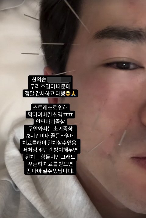 이민우는 17일 "스트레스로 인해 망가져 버린 신경. 안면마비 증상 구안와사는 초기 증상 72시간 이내 골든타임에 치료를 해야 완치할 수 있음"이라고 적었다.