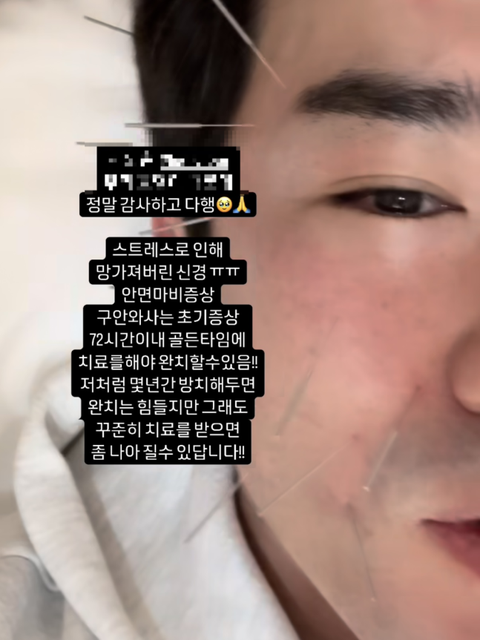 사진 속 이민우는 안면신경마비 증세를 완화시키기 위한 침 치료를 받는 모습이다. 이민우는 “72시간이내 골든타임에 치료를 해야 완치할 수 있다. 나처럼 몇년간 방치해두면 완치는 힘들지만 그래도 꾸준한 치료를 받으면 좀 나아질 수 있답니다”라고 알렸다.