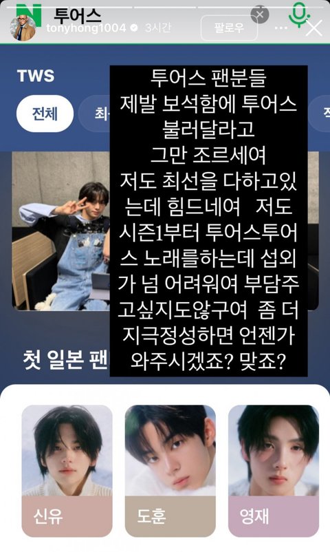 정작 플레디스는 투어스 보석함 출연 거부 빅히트는 게이 투표 높은 수빈 대신 연준 출연시킴 ㅋㅋㅋㅋㅋ 게이픽이 그리 부러우면 sm이 가지세요 더쿠 핫게도 많이 보내시고 ㅎㅇㅌ