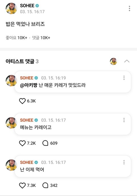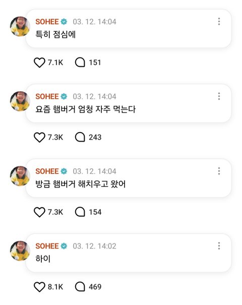 니들 진짜 정.신.병.자세요? 타멤들도 다 하는 밥 얘기, 연습얘기 성찬이 자주와서 얘기한다고 지겹다고 꼬투리 잡아서 여기저기 도배질해서 피떡만들어 놓고 이제와서 뭔 판 밖에 반응없었든데 이 지랄하면서 꽁지 빼냐? 쉬는날 타그룹 멤버랑 목격담 떴다고 일주일에 두세번은 꼭 소통왔던 성찬 쥐잡든이 팼잖아 당장 여기도 범규 운운하면서 도배글 쌌던것만 몇갠데 웃기지도 않아 그래서 성찬 팼던 그 대망의 쉬는날 소통왔던거 소희밖에 더 있었음? 성찬이 자주자주 혼자 얘기하고 간다고 조카 만만하냐? 팬들 주된 반응 다 보고 지 혼자 티엠아 풀던것도 지겹다고 패고 진심 질린다 당장 최근 타멤들 밥얘기는 지겨워서 어떻게 참았니 응?