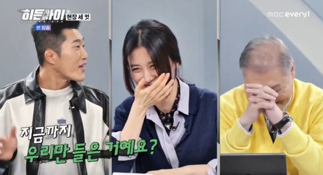 그런 가운데 현장 세 컷이 공개됐다. 박하선은 개와 새가 있는 것 같다고 추측하며 "개새?"라고 했다. 이에 김성주는 "뭐만 나오면 '개새'야"라며 "하선 씨만 오디오 감독님이 따로 (비속어) 점검하는 거 알죠"라고 밝혔다. '히든아이'에선 분노를 유발하는 사건·사고가 자주 등장하는바. 김성주는 "물의 일으킬까 봐 우리가 들은 얘기 중에 거의 안 나간다. 많이 보호해 드리고 있다"고 했고, 김동현은 "지금까지 우리만 들은 거냐"고 말했다.