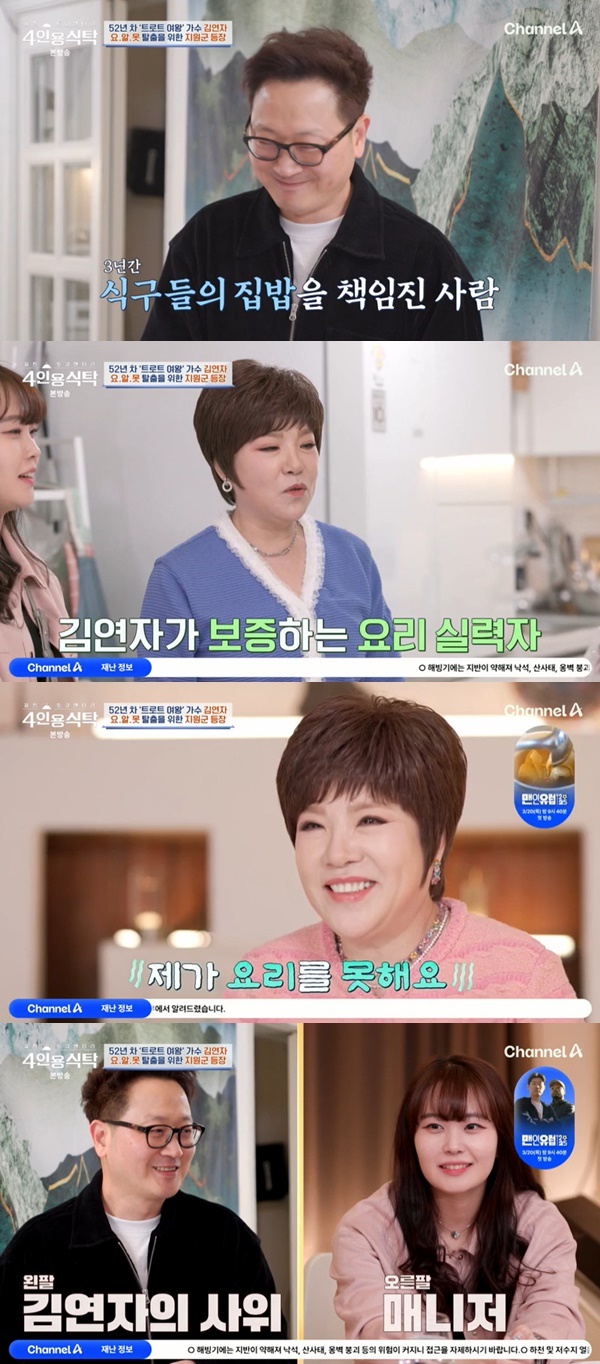 채널A ‘절친 토큐멘터리 4인용식탁’ 캡처이어 김연자는 “‘4인용식탁’을 봐왔는데 주인공이 요리해서 대접을 하더라. 그런데 창피한 이야기지만 제가 요리를 못 한다. 어떻게 할까 하다가 부탁을 했다”며 “남자가 사위고, 여자는 매니저”라고 소개했다.