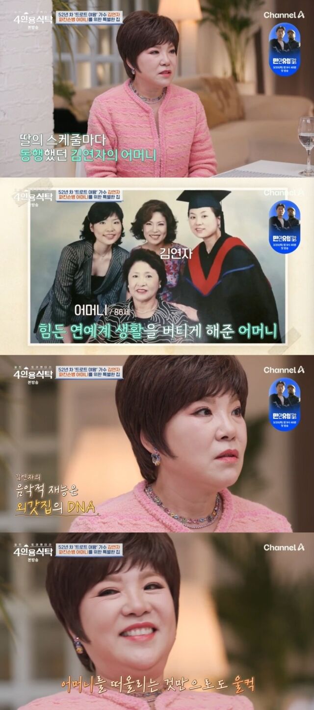 그러자 김연자는 "내가 자꾸 엄마 이야기를 안 하려고 하는데…"라더니 채 말을 잇지 못하고 울컥하는 모습을 보였다. 애써 눈물을 참아보려 했지만 눈가가 촉촉해지는 것을 막지는 못했다. 홍지윤은 "엄마라는 단어가 어린 친구도, 나이 있는 사람도 다 (눈물을 부른다"라고 위로했다.채널A '절친 토큐멘터리 - 4인용식탁'/채널A '절친 토큐멘터리 - 4인용식탁' 방송 캡처