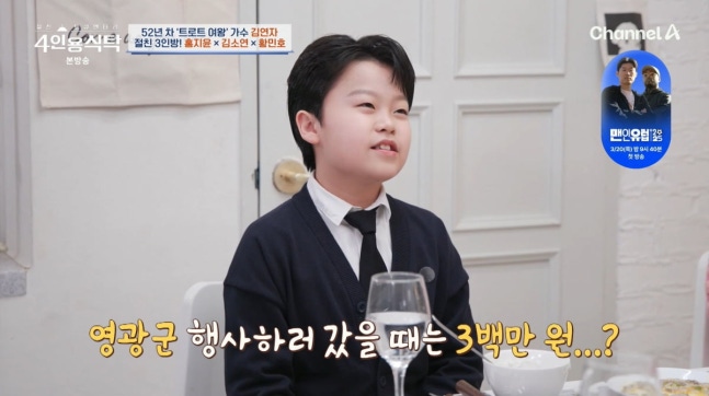 사진=채널A '4인용식탁'황민호는 "영광군 행사에서 300만원 용돈을 받은 적이 있다. 주머니가 다 안 들어가서 비닐봉지에 따로 담아서 왔다"고 말했다. 김소연은 "행사 페이가 아니고 용돈만 300만원이냐"며 놀라워했다.
