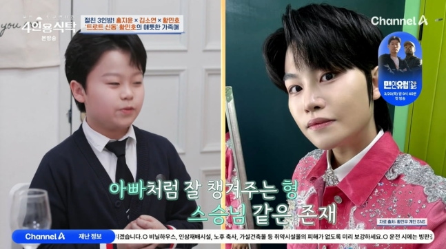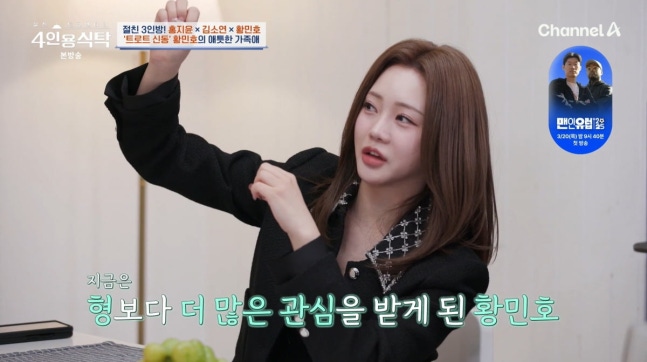 사진=채널A '4인용식탁'"민호 형이 고생 많이 했다"는 김연자의 말에 홍지윤은 "형이 예전에 '리틀 싸이'로 스포트라이트를 많이 받다가 이제는 동생이 인기가 많아졌는데 조금의 질투심도 없냐"고 궁금해했다.