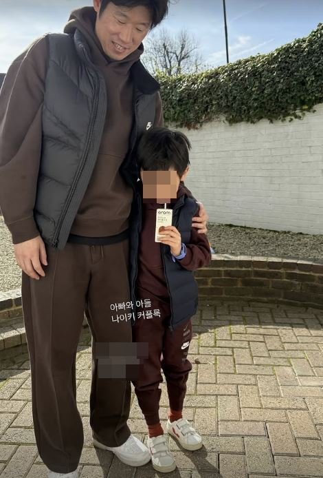 공개된 사진 속에는 박지성과 아들의 모습이 담겼다. 박지성은 아들과 똑같이 트레이닝복에 패딩조끼를 매치, 커플룩을 완성한 모습. 아들을 어깨를 감싸고 있는 아빠 박지성의 근황이 눈길을 끈다.