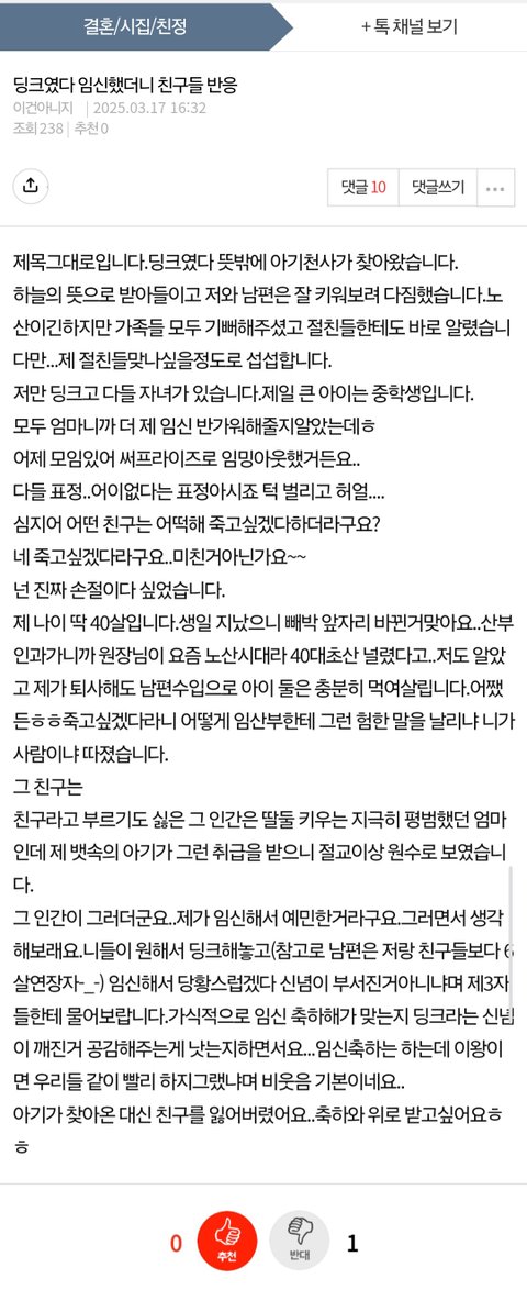 친구들이 저래 반응하는거 보면 그 전까지 저 ㅋㄷ터져 생긴 아줌마가 뱉은 말이 어느정도인지 예상 가능함 ㅋㅋㅋㅋ 대충 임신하면 손해다 부터 시작해서 애 키우는데 뭐시기 저시기 부정적인 말 서슴치 않았을건데 친구들이 오히려 나가떨어지는거 이득일듯 ㅋㅋㅋ