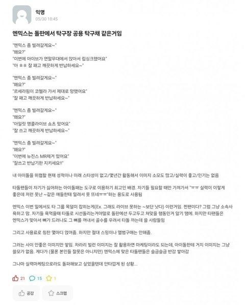 엔믹스는 돌판에서 탁구장 공용 탁구채 같은 거임