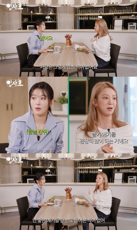최근 진행된 SM 단체 콘서트에 대한 얘기도 나왔다. 뒤풀이가 없었던 것에 대해 슬기는 “하는 줄 알았는데 안 해서 저는 서운했다. 그때 확 돈독해지는데”라며 아쉬워했다.