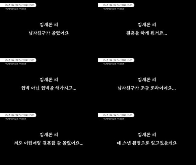 B씨는 “기자들에게 전화 와서 ‘남자친구랑 결혼하는 거 맞냐’고 하는데 남자친구 아니라고 했다. 내가 분명히 크리스마스 때도 보고 밥도 먹고 했는데 걔가 아니다. 그럼 상식적으로 애들끼리 헤어졌다 만날 수도 있는데 너는 크리스마스 때 봤던 애가 아닌데 그 남자랑 어떻게 결혼한다고 사진 올릴 수 있겠냐. 내가 봤을 땐 콘셉트 화보 같다고 얼버무리고 있다. 결혼식 한거냐”고 물었다. 이에 故김새론으로 추정되는 여성은 “이미 한 게 맞다. 해외에서 했다”고 말했다.