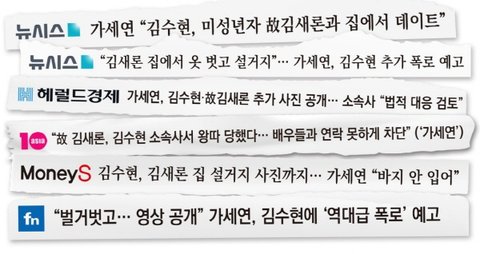 주요 폭로가 있을 때마다 연일 '가세연발' 보도가 나왔다. 소속사의 반론(입장문)이 형식상 담겨 있었지만 별도의 취재는 없었다. 3월11일 <"나 좀 살려줘, 부탁할게"…가세연, 故 김새론 문자 공개>(한국경제), 3월12일 <가세연, 김수현 추가 폭로…"고 김새론 애칭은 새로네로">(MBN) 3월13일 <김수현, 김새론과 다정 셀카 또..가세연 "사진 더 있다" 폭로 예고>(OSEN) 등의 기사가 이어졌다.