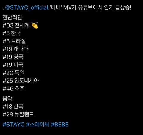 스테이씨 베베가 너튜브 월드와이드 3위를 달성했대