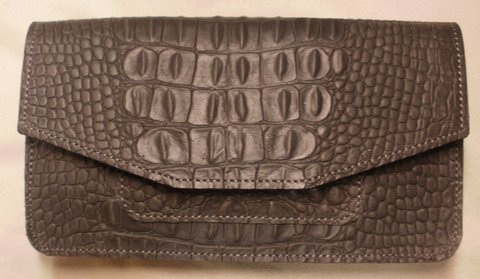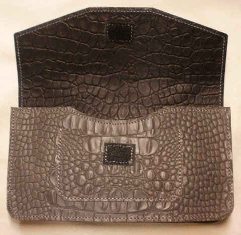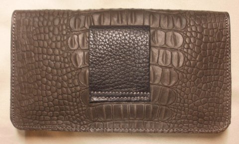 다크 그레이 컬러 악어 무늬 엠보싱 가죽으로 제작한 벨트용 휴대폰 백입니다.(마디샤)