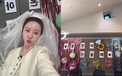 사진 속 정숙은 하얀색 면사포를 뒤집어쓰고 미모를 뽐내고 있다. 뒷배경에는 '결혼아 은율해'라는 문구와 함께 반지 풍선 등 20기 정숙을 위해 준비된 화려한 장식들이 꾸며져 있다.
