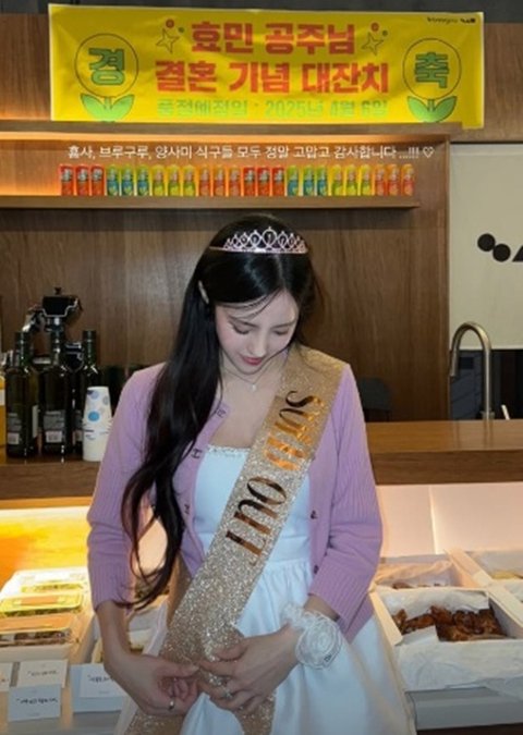 공개된 사진 속에는 결혼을 앞두고 파티를 연 효민의 모습이 담겼다. 효민은 미니 화이트 드레스를 입고 왕관과 'SOLD OUT'이라고 적힌 띠를 두르고 있다.