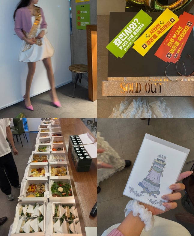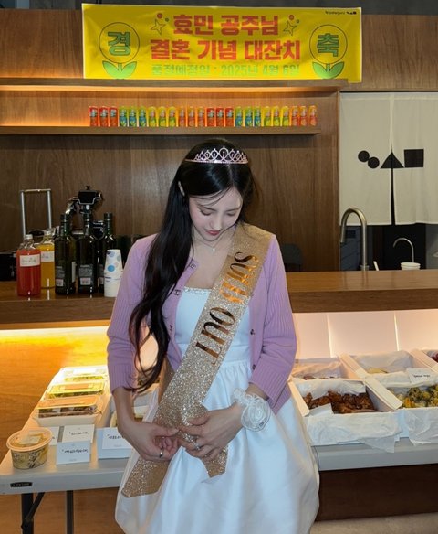 공개된 사진 속에는 결혼을 앞두고 파티를 벌이고 있는 효민과 지인들의 모습이 담겨 있다. 효민은 하얀색 원피스에 분홍 가디건을 걸치고 티아라 왕관을 쓴 채 포즈를 취하고 있다. 특히 황금빛으로 ‘SOLD OUT’이라고 적힌 띠를 두르고 있어 눈길을 끈다.