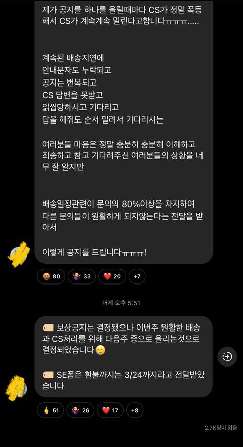 이번엔 검수 핑계를 대며 또 배송지연을 공지