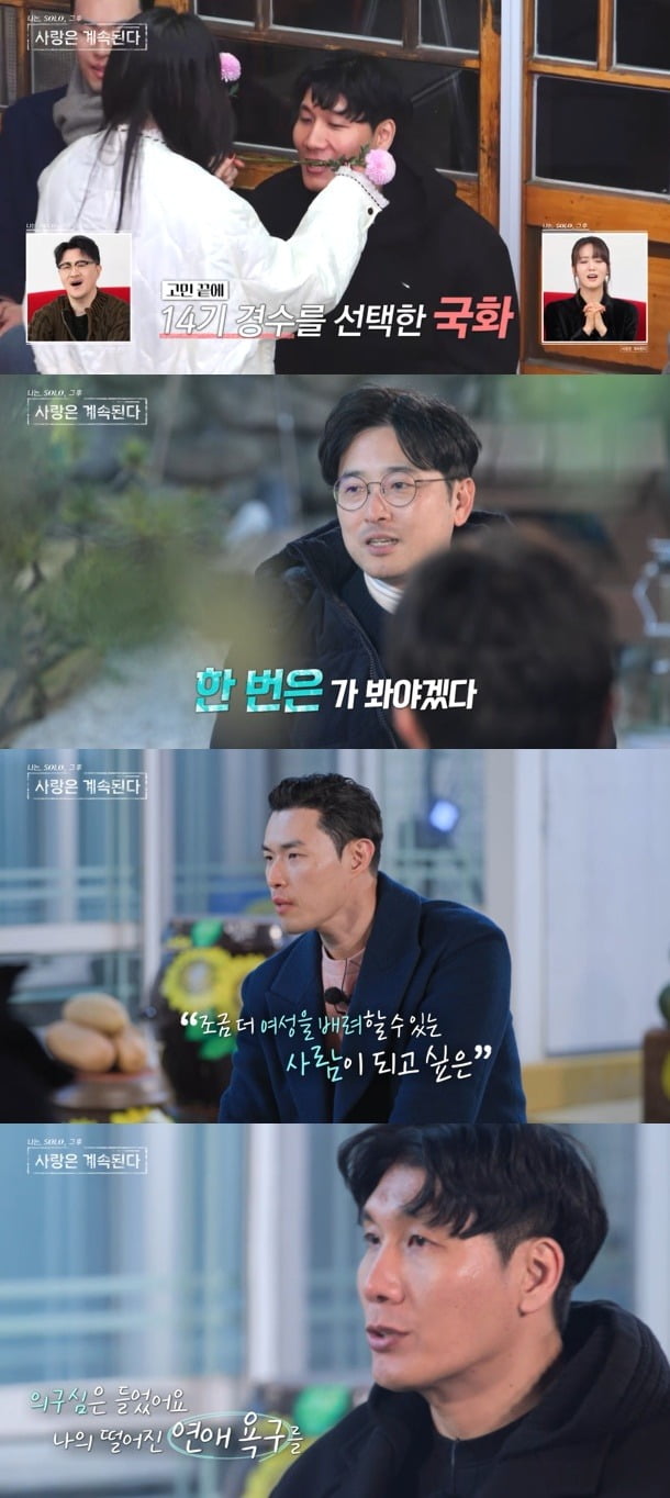 사진=ENA와 SBS Plus '나솔사계' 캡처여자 출연자들의 선택도 이어졌다. 백합은 키가 크고 듬직하며 유머 감각이 있는 사람에게 끌렸다며 14기 경수를 선택했다. 이에 10기 영식은 기대했지만 아쉬운 마음을 감추지 못했다. 국화는 상대방을 배려하는 태도가 인상적이라며 14기 경수를 선택했고, 동백 또한 강인한 인상을 이유로 같은 선택을 했다.