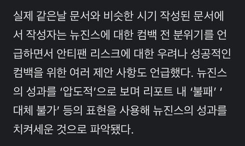 이때싶아니고 민희진도 볼 수 있는 문건이라 뉴진스 욕할 수가 없는게 뻔했는데 문건으로 빡친 반응 이용해서 내용 자체를 왜곡하려는게 보였음.. 부정적 언급이라고 찾아낸 뉴아르도 누군가가 뒤늦게 몰아서읽다가 오해한거 뻔했고 (아일릿 데뷔 한참전이라 아이브인데 아일릿이라고 오해╋뉴진스를 회사가 버린단게 아니고 뉴아르에서 뉴 빼서 르세라핌을 다른 카테고리로 묶어야한단 내용╋전후 맥락에 뉴진스를 저렇게 올려침) 뷔 솔로랑 태민 앨범패키징 비슷하단 논란 언급한 문건에서도 결론이 뭔 민희진이 만들어온 소년이미지에 둘이 속하고 웅앵거리면서 민희진 금칠만 해주드만... 하이브 문건이 잘했단게 아니고 (하이브 죽어!) 뉴진스나 민희진을 비난한 문건은 정작 없는데 저걸 이용하는게 눈에 보이니까 너무 짜쳤음ㅋㅋㅋ 솔직히 여론전 하려고 내부 몇명이나 읽고말았을 타사 아이돌들 악플수준 평가에 확성기 대주고 대대적으로 봐달라고 뿌린거잖아... 정작 피해돌들은 언급도 못하는데 뉴진스만 미안해서 타사 남돌이랑 합동무대 못하겠다고 짜치는 언플이나 하고 (원래도 그런거 한적 없으면서ㅋㅋ...) 진심 너무 이기적임