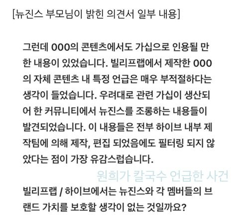 증거도 없이 고작 들었던거 '같습니다'따위로 직장내 괴롭힘이라니 사회적 문제라니 온갖 동정은 다 받고 잘못 1도 없는 후배그룹 데뷔하자마자 욕받이 만들고 지들한테 무시해라고 한거 '같습니다'라고 지목했던 매니저는 반강제 퇴사, 정신과까지 드나들게 만들어놓고 정작 니들은 부모랑 합동해서 후배그룹 집단적으로 매장시킨거 실화임? 죄책감 안드냐?