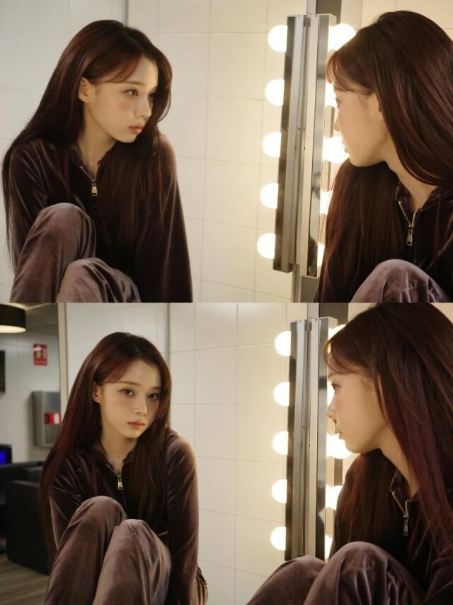 사진 속에는 벨벳 소재의 트레이닝 복을 입고 거울을 바라보고 있는 윈터의 모습이 담겼다. 대기실에 밝게 조명이 들었지만 어둡게 가라앉은, 몽환적이면서도 묘한 분위기가 엿보인다. 우수에 찬 눈빛 연기 또한 일품이다.