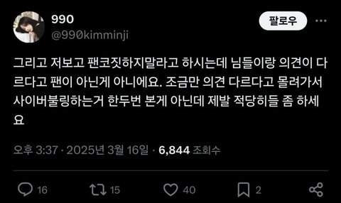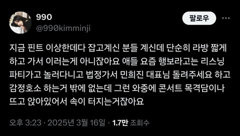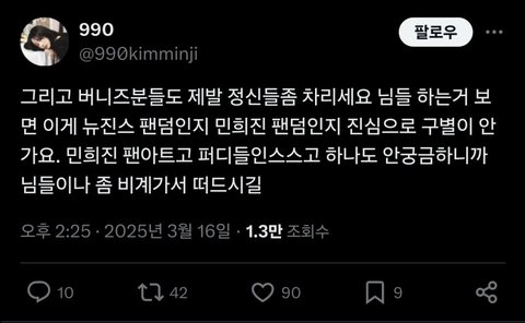 대놓고 찐팬인 홈마가 나서서 바른말 해도 “방시혁이세요?” 이러는 애들이니까 커뮤에서도 조금만 뉴진스한테 비판적인 여론 나와도 방저씨 합저씨 릇저씨 하이브알바 개저씨 걸플갤 꺼져 이러고 있지 ㅋㅋㅋㅋㅋㅋㅋㅋㅋㅋ