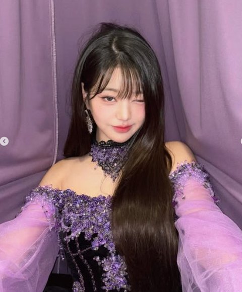 사진 속 장원영은 어깨를 드러낸 오프숄더 미니 드레스를 입은 모습이다. 전체적으로 보라색과 검은색이 조화를 이룬 로맨틱한 의상으로 팔 부분을 시스루 처리하고 짧은 길이로 날씬한 각선미를 드러냈다.