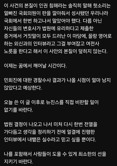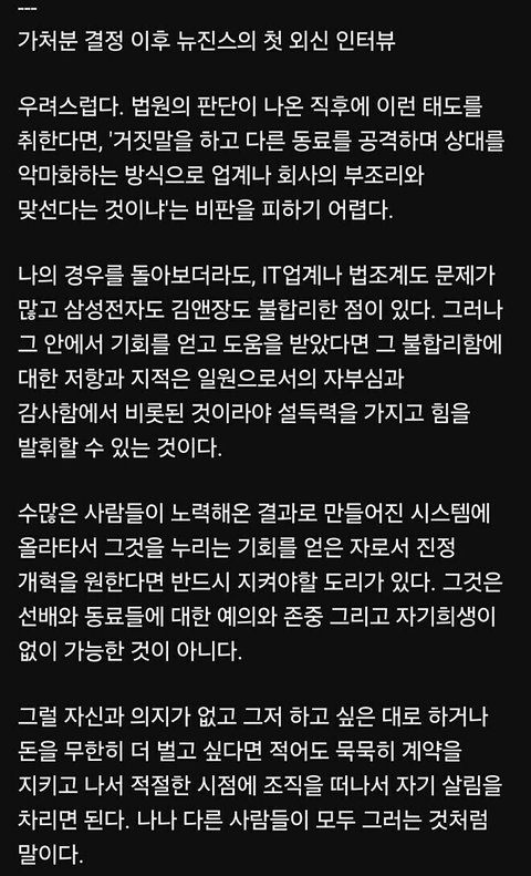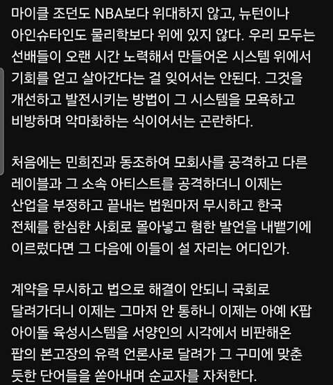 뉴진스를 비판하는 게 오늘이 마지막이길 바란다 법원 결정이 나오고 생각을 정리하기 전 급하게 진행한 인터뷰에서 내뱉은 실수라고 믿고싶다 나도 돕고싶으니까 선은 지켜라