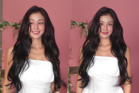화보 촬영으로 보이는 이 날의 콘셉트는 한 송이 꽃처럼 아름답고 성숙한 여성의 이미지를 강조한 듯하다. 플로럴 장식과 핑크 배경이 어우러져 마치 한 편의 동화 속 장면 같은 느낌을 자아낸다.