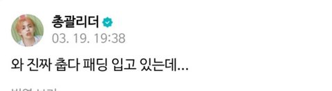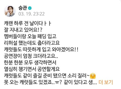 오늘 리허설하는데 너무 추워서 캐럿들 걱정된다고 따뜻하게 입고오라는 말...