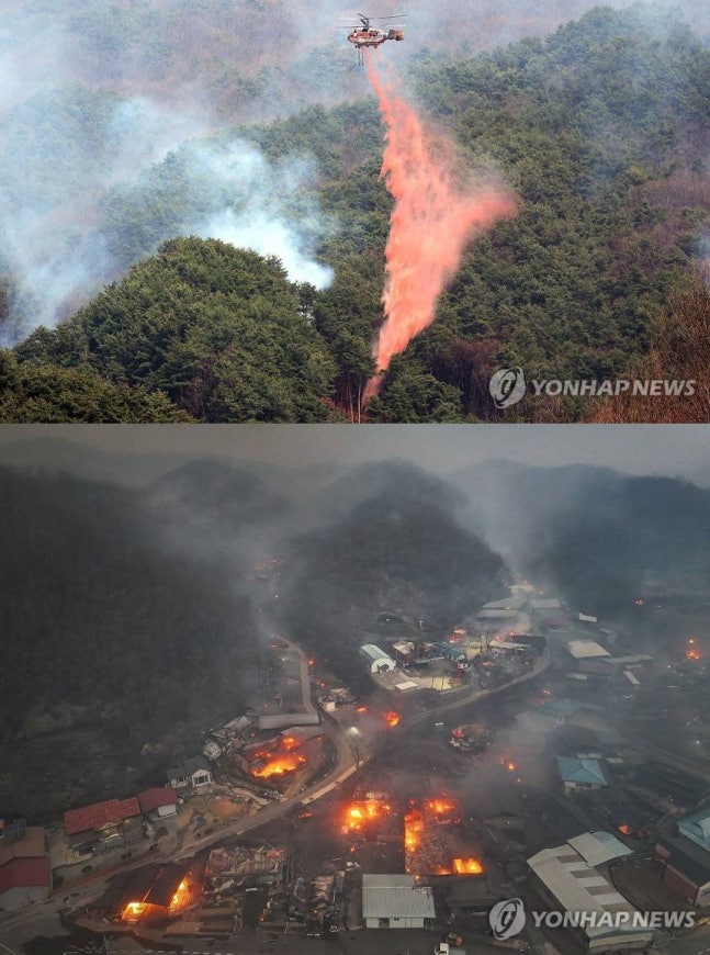 지난 22일 의성에서 시작된 산불이 25일 오후 안동시 풍천면에 있는 하회마을과 직선거리로 10㎞까지 다가온 후 밤사이 더 근접했다. 축구장 1만2000개 규모의 산림이 불에 탔으며, 진화 대원과 공무원 등 4명이 숨졌다.