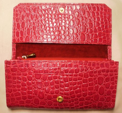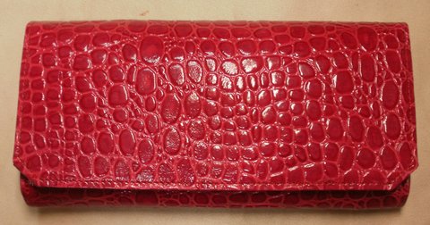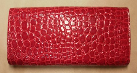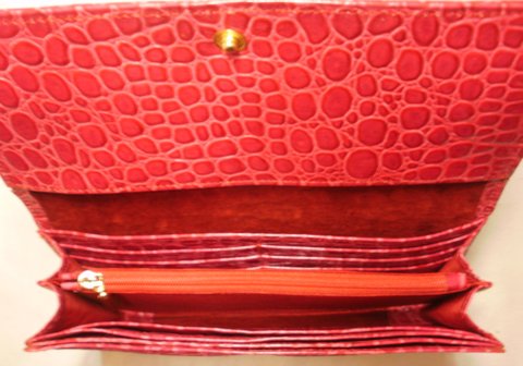 레드 컬러 계열 자갈 무늬 엠보싱 및 에나멜 코팅된 천연 가죽으로 제작한 휴대폰 수납 가능한 장지갑입니다.(마디샤가죽공예)