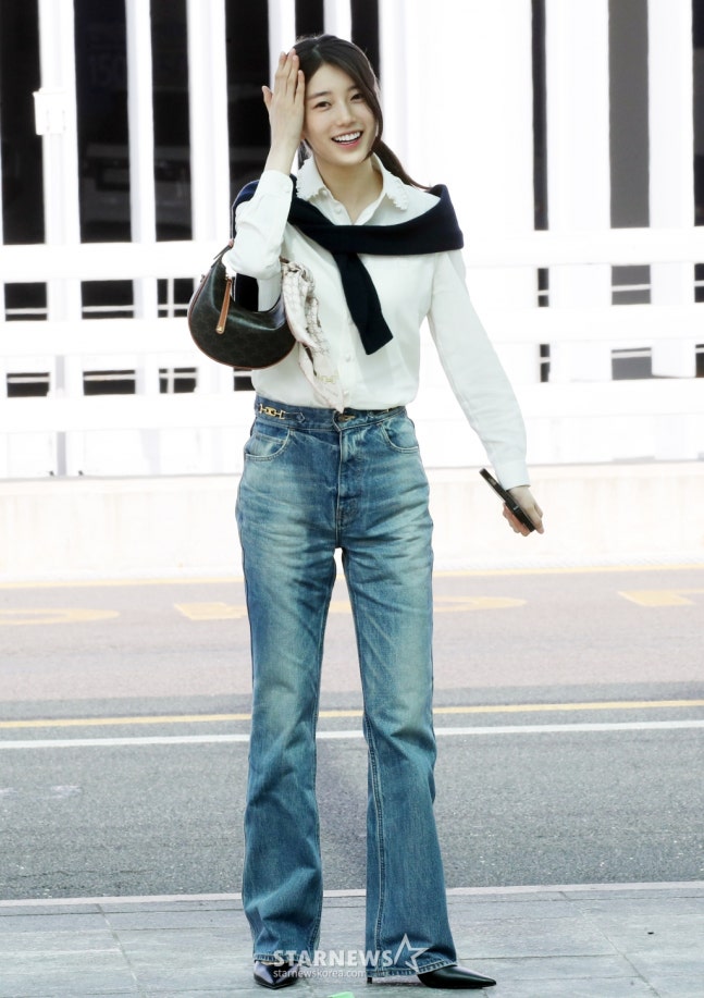 이날 수지는 흰색 블라우스에 청바지를 입었다. 센 바람에 가디건을 어깨위로 살짝 묶었다.