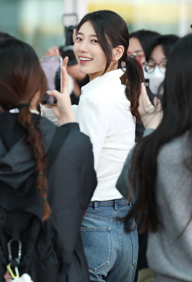 배우 수지가 명품 브랜드 행사 차 26일 오전 인천국제공항을 통해 출국하고 있다. 2025.03.26 /사진=임성균 tjdrbs23@수지는 화장기도 거의 없는 얼굴에 머리카락을 질끈 묶고 나타났다. 꾸지미 않아도 완벽한 미모로 시선을 사로잡았다.