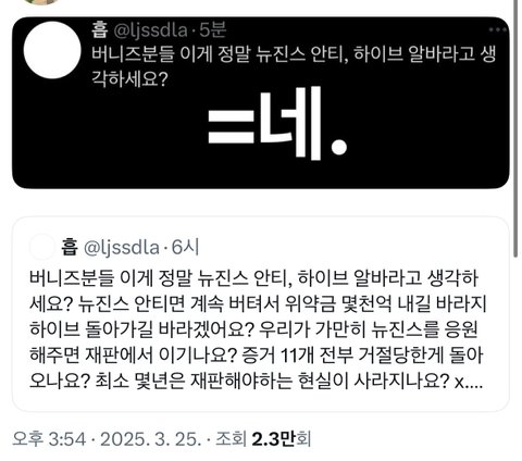 본인 문제에 끌어 들이지 말고 뉴진스도 민희진과 선긋고 오히려 하이브에게 정당한
