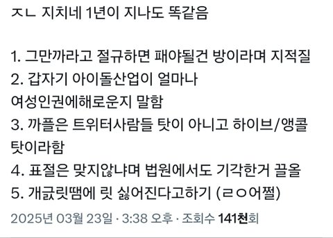 1년동안 별 개솔을 다 해놓고서 우린 잘못없어~ 까일만 했잖아 하는거 웃기지 않냐? 그만 좀 엮어라.