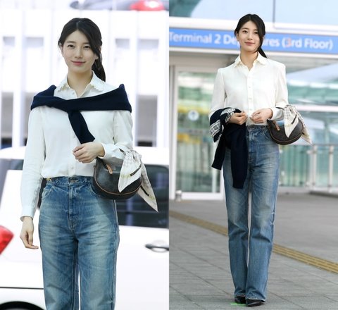 이날 수지는 우아하면서도 캐주얼한 패션으로 시선을 사로잡았다. 흰 셔츠에 청바지라는 클래식한 코디에 가디건을 레이어드해 우아함을 더했다. 여기에 미니 백에 반다나를 묶어 포인트를 줬다.