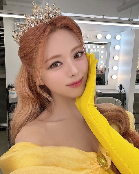 주황색 반묶음 웨이브 머리에 샛노란 드레스업에 무게감 느껴지는 티아라까지