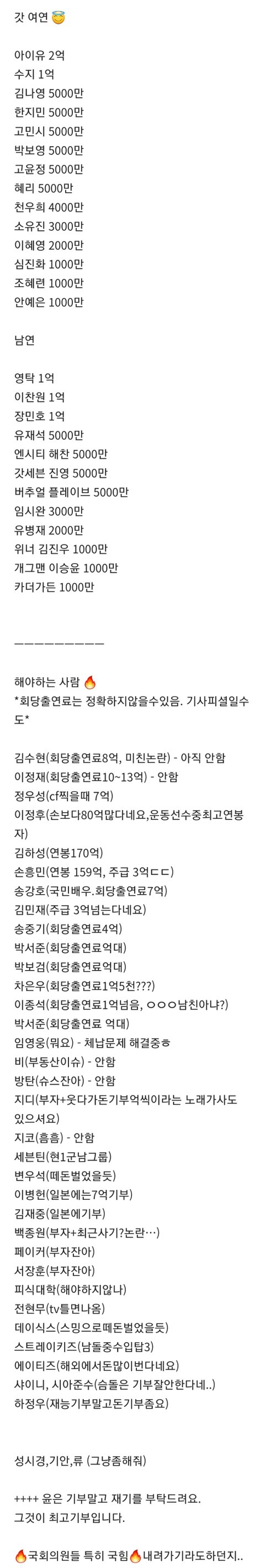 기부 리스트까진 그냥 고마운사람 기억해주는거니까 ㄱㅊ은데 기부해야할 사람에 논란없이 잘 활동하고있는 사람은 왜 끼워넣음…?