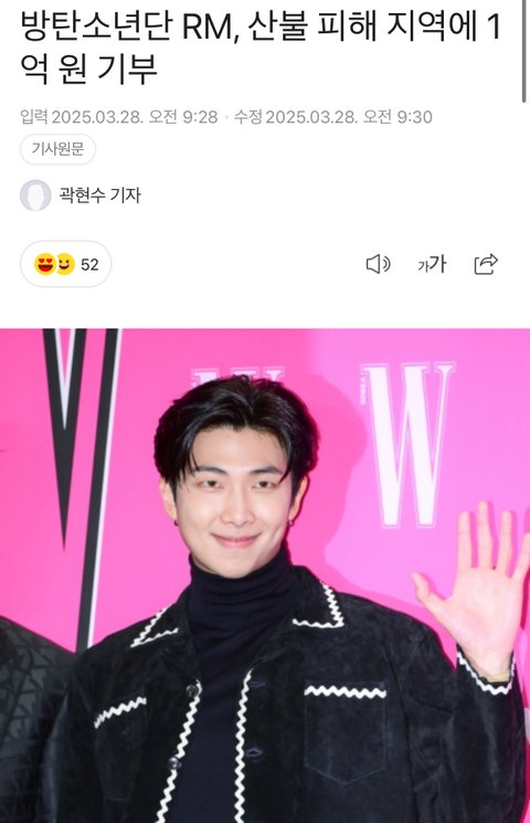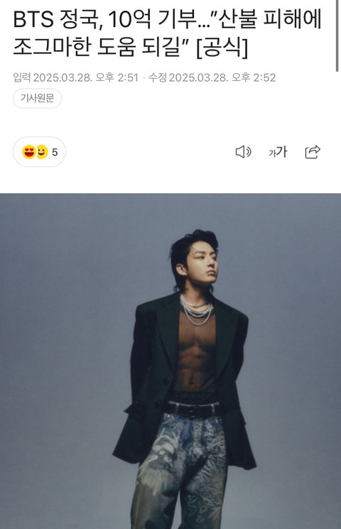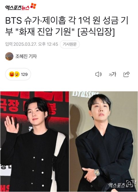 방탄 슈가 제이홉 산불피해 1억원씩 기부했대(+ RM, 정국도 기부)