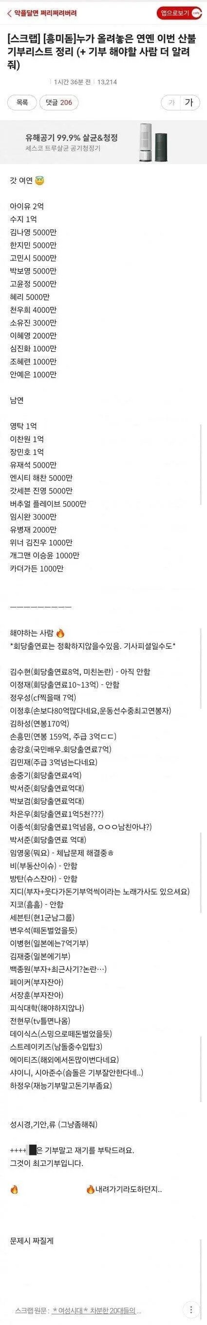 기부 안한 연예인들한테는 기부 해달라고 인스타 댓글 달리는 중인듯