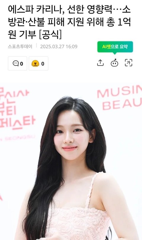 와 그룹으로 1억도 큰 돈 인데 카리나 혼자 1억은 진짜 대단함ㅋㅋㅋㅋㅋ 카리나 덕분에 카리나 갤에서도 다들 기부 하던데 선한 영향력 멋짐