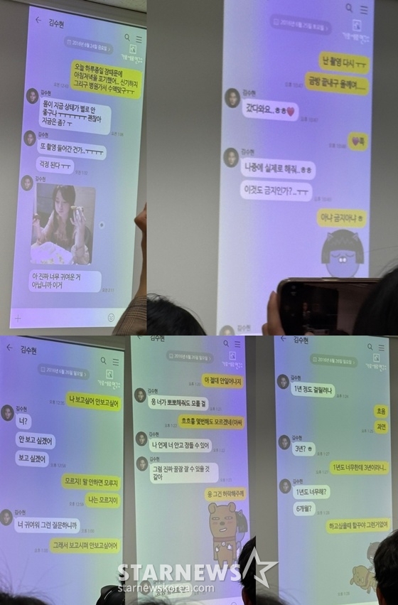 김새론 유족 측이 공개한 카톡뒤이어 부 변호사는 "김새론이 17세(연나이) 때 김수현과 주고받은 카톡을 재구성해 보여드린다"라며 김새론과 김수현 이름이 적힌 카톡 대화 내용을 공개했다.김세의는 "카톡 원본은 개인정보를 가려야 할 부분이 있어서, 그 부분을 제외하여 재구성한 내용을 보여드린 거다. 없는 내용을 짜깁기 한 건 아니라는 점 분명히 말씀드린다. 원본은 갖고 있다"라는 설명을 덧붙였다.