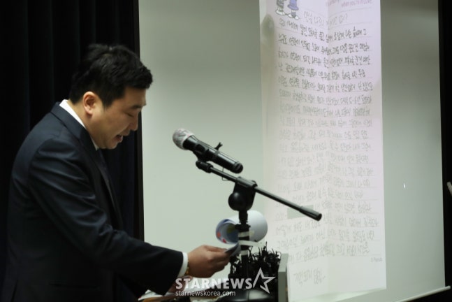 故 김새론 유족들의 법률대리인 부지석 법무법인 부유 변호사가 27일 서울 서초구 모처에서 열린 기자회견에서 故 김새론과 배우 김수현의 대화 내용을 공개하고 있다. /사진=김휘선 hwijpg@더불어 부 변호사는 "김새론이 생전 골드메달리스트로부터 내용증명을 받고 작성했던 편지다. 끝내 김수현에게 전달하진 못했다"라고 설명하며 손편지도 화면에 띄웠다.해당 편지에서도 김새론은 골드메달리스트 측과 연락이 닿지 않는 점을 토로하는가 하면, 김수현에 대해 "첫사랑이자 마지막 사랑"이라며 애정을 표했다.