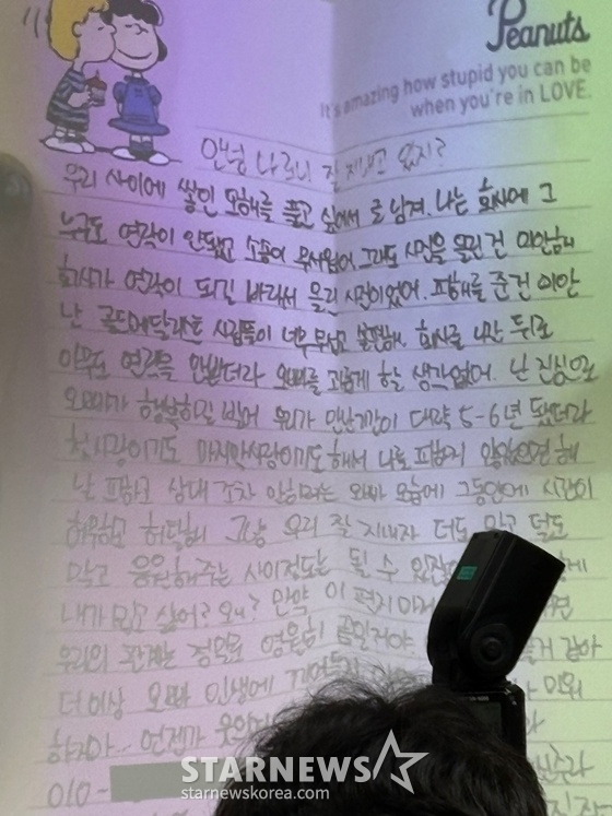 김새론은 "010-OOOO-OOOO 내 번호야. 편지 읽으면 회신주라. 어떻게 해도 내 진심을 전할 방법이 없어서 집 주소가 그대로이길. (이)로베가 아닌 네가 읽기를. 앞으로도 너의 일, 연애 다 응원하고 행복하길. 그리고 서로의 시간을 나쁘게 기억되지 않길"이라는 응원으로 편지를 마무리지었다.