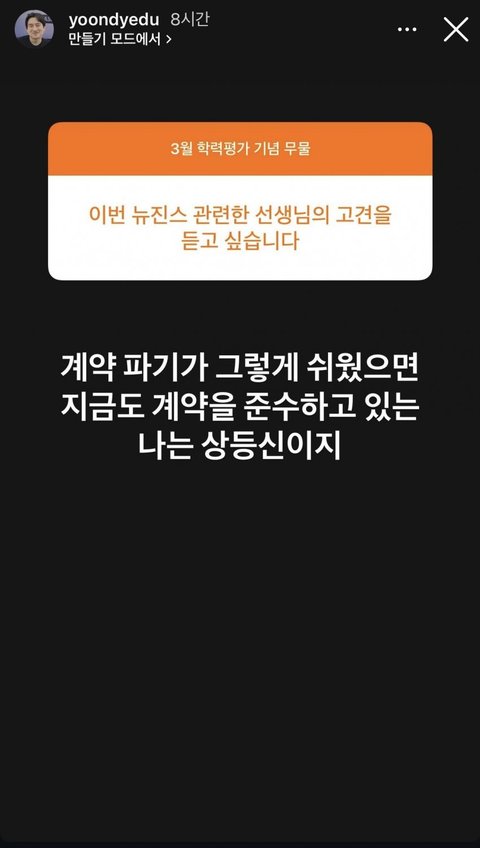 윤도영 계약 문제로 골머리 앓은 적 있을걸 ? 계약 파기 문제 경험자인데 말도 못 얹나? 단순 선생이 연예인 까는게 아니라 .. 입시 비리 뉴스 같은거 보면 입시하고 있는 10대들이 제일 속에서 천불 나잖아 애초에 법조인들도 뉴진스 문제가 가장 큰게 이 사례가 인정되면 우리 일상의 계약들의 혼란을 초래하는 전례가 생긴다했음